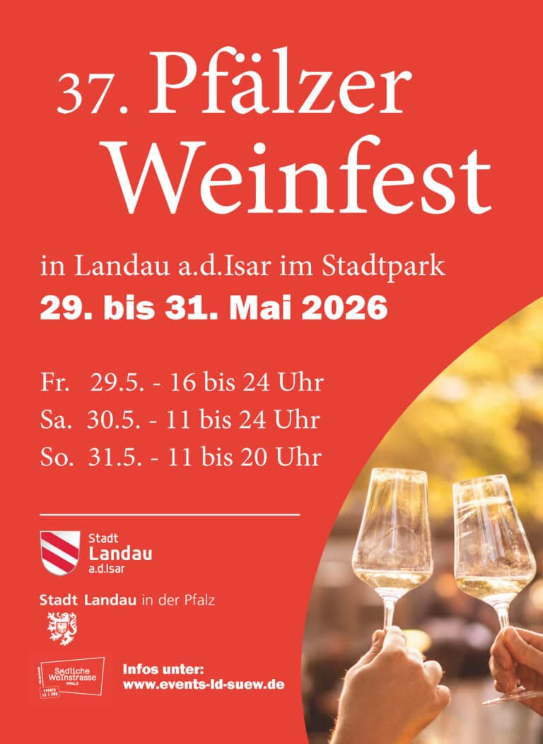 Die pfälzische Weinkultur nach Bayern bringen und dabei Freunde treffen: Das ist die Idee des Pfälzer Weinfests, das seit mehr als 30 Jahren einmal im Jahr im niederbayerischen Landau an der Isar stattfindet. Vom 29. bis 31. Mai 2026 sind die Veranstaltungsgesellschaft Landau-Südliche Weinstraße und das Büro für Tourismus des pfälzischen Landaus zum 37. Pfälzer Weinfest in der Schwesterstadt zu Gast.