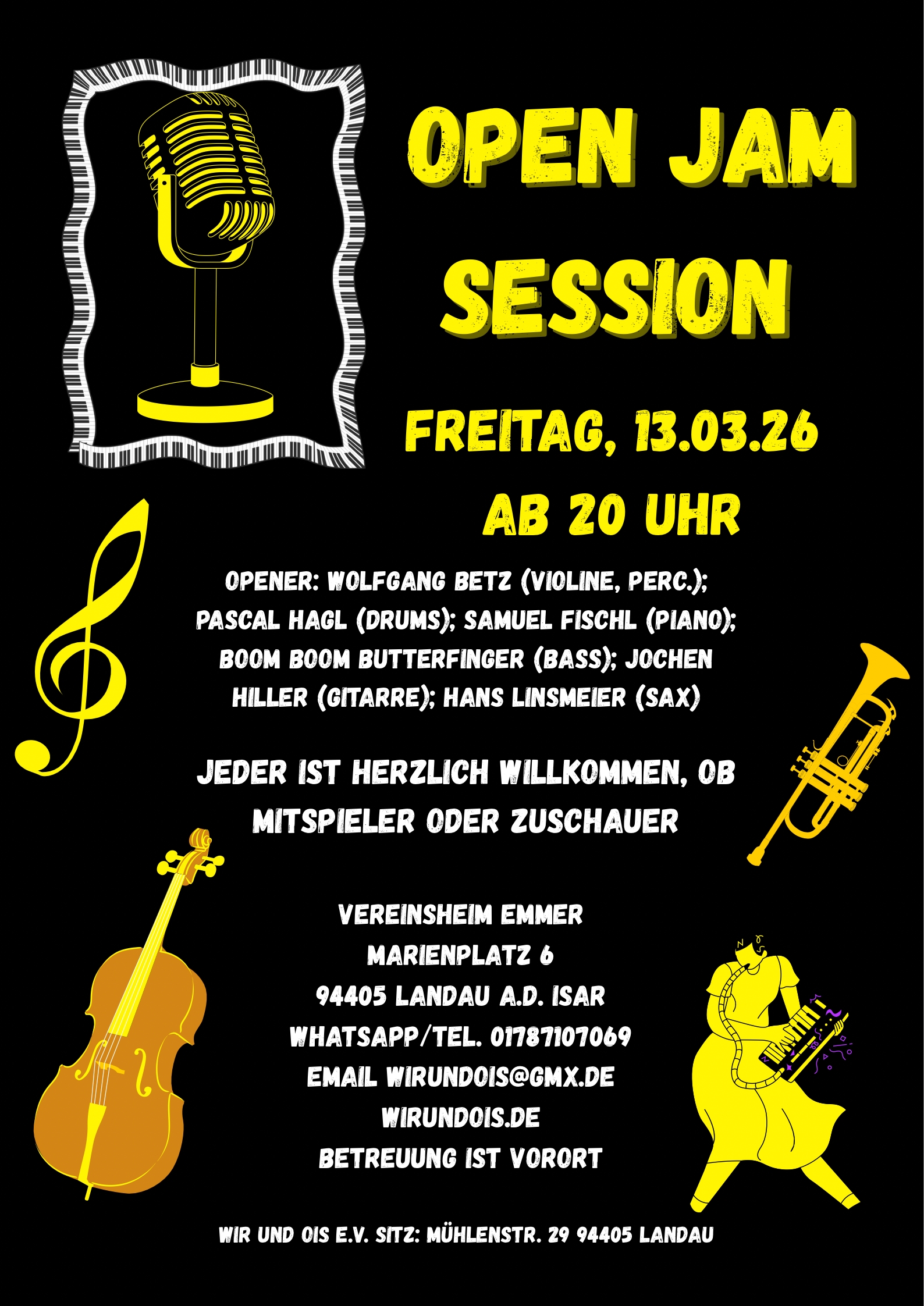 Hallo Leute, es ist wieder **Jam Session Zeit** im Wir Und Ois e.V.! Den Abend eröffnet **Wolfgang Betz, Pascal Hagl, Samuel Fischl, Boom Boom Butterfinger, Jochen Hiller und Hans Linsmeier** – danach ist die Bühne offen für alle, die Lust auf Musik haben! Natürlich ist wieder eine Betreuung vor Ort – perfekt für alle, die sich noch nicht so trauen oder ganz am Anfang ihrer Jam-Session-Karriere stehen. 💛 --- 📅 **Wann:** Freitag, 13.03.2026 ab 20:00 Uhr 📍 **Wo:** Vereinsheim im Café Emmer Marienplatz 6, 94405 Landau an der Isar Anmeldungen sind erforderlich --- 🎵 **Musikalisch ist alles erlaubt:** Jazz, Rock, Pop etc. oder eigene Songs – spielt, was euch Spaß macht! 🎹 Keys und Schlagzeug sind vor Ort. 🎼 Bitte bringt bei Bedarf eure Noten mit. 🎸 Eigene Instrumente bitte selbst mitbringen. --- 🍹 Fürs leibliche Wohl ist bestens gesorgt: Bio-Getränke, Bio-Biere, Cocktails, Kaffeespezialitäten sowie Süßes und Pikantes erwarten euch. Kommt vorbei, sagt es weiter und macht mit Musik! Wir freuen uns auf euch! 🎶✨ *Musikalische Begleitung erfolgt ausschließlich mit entsprechend lizenzierten oder GEMA-freien Inhalten im Rahmen der Bildungsarbeit.*