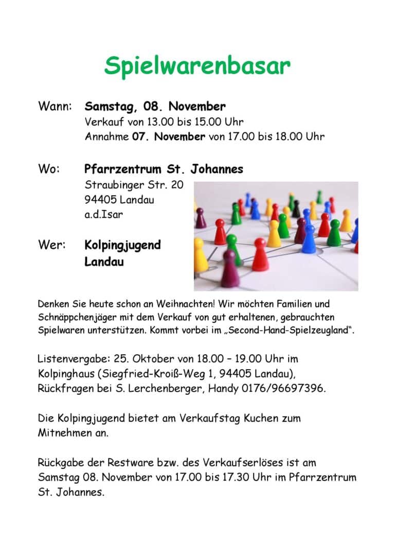 Listenvergabe für Anbieter am 25. Oktober, von 18 - 19 Uhr, im Kolpinghaus (Siegfried-Kroiß-Weg 1, Landau). Warenannahme 7. November, von 17 - 18 Uhr im Pfarrzentrum (Straubinger Straße 20). Rückgabe Erlös/Restware 8. November, 17 - 17:30 Uhr.