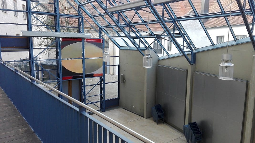 Hinzu kommt ein 72 m² großer Nebenraum im 1. Obergeschoss, der über eine Treppe erschlossen ist. Mit seinen ausklappbaren Seitenwänden eignet sich der Glassaal hervorragend für Ausstellungen aller Art.